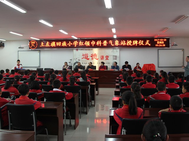 3月23日上午, 土默特左旗回族小学红领巾科普气象站落成仪式在该校礼堂举行。呼市科协、呼市气象局、呼市气象学会、土左旗科协和土左旗气象局主要领导参加了揭牌仪式,并开展了气象科普讲座、观测培训、赠送科普读物等一系列科普进校园的活动。通过红领巾气象站的建立以及组织丰富多彩的气象科普主题教育活动,让气象这门既熟悉又神秘、既通俗又严谨的科学通俗化、知识化和普及化。