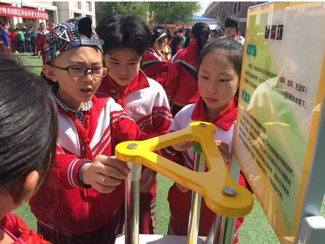 活动在巴彦淖尔南路小学操场举行,有600余人参与活动。展出最新科普展具26件,有天鹅绒触觉、翻转的镜像、双曲狭缝、最速降线、锥体上滚等科普现象,涵盖“电磁现象”、“运动与力”、“机械传动”、“视觉体验”、“数学思维”、“材料科学”等科学知识和科学原理,同学们兴致勃勃、争先恐后地围着展台驻足观看了解、时不时动手摆弄一下,边看、边问、边操作,大家互相探秘,在娱乐中悟出科学原理。校园里,科普大篷车播放的科普影视电影同样吸引着同学们的眼球,被同学们紧紧包围,播放完毕后仍不舍离开。