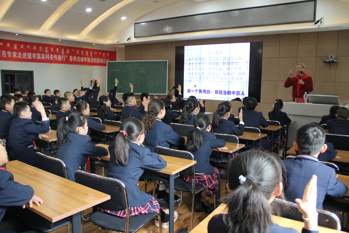 活动现场,高虹宣布2019年内蒙古自治区“百名专家走进盟市旗县科普传播行”春季活动呼和浩特站启动,卜音太和徐雅琴先后致辞。卜音太表示,呼和浩特市科协将认真组织好本次“百名专家走进盟市旗县科普传播行”活动,为专家开展讲座指导提供优质、高校、全方位的服务。徐雅琴希望同学们珍惜这次机会,认真聆听讲座,多与专家交流,认真学习科学知识,掌握科学方法和本领。随后,苏虎街实验小学五年级二班的全体同学为大家朗诵《科技引领时代 智慧点亮生活》。