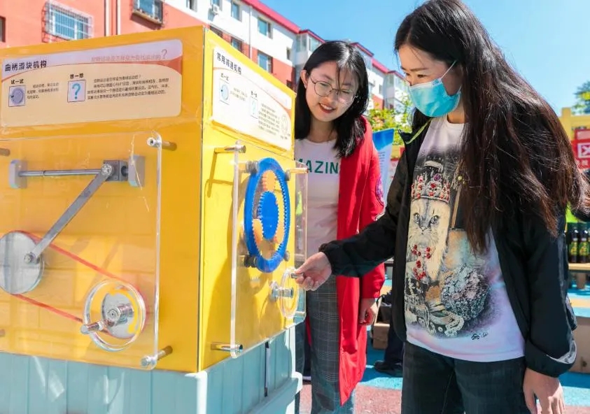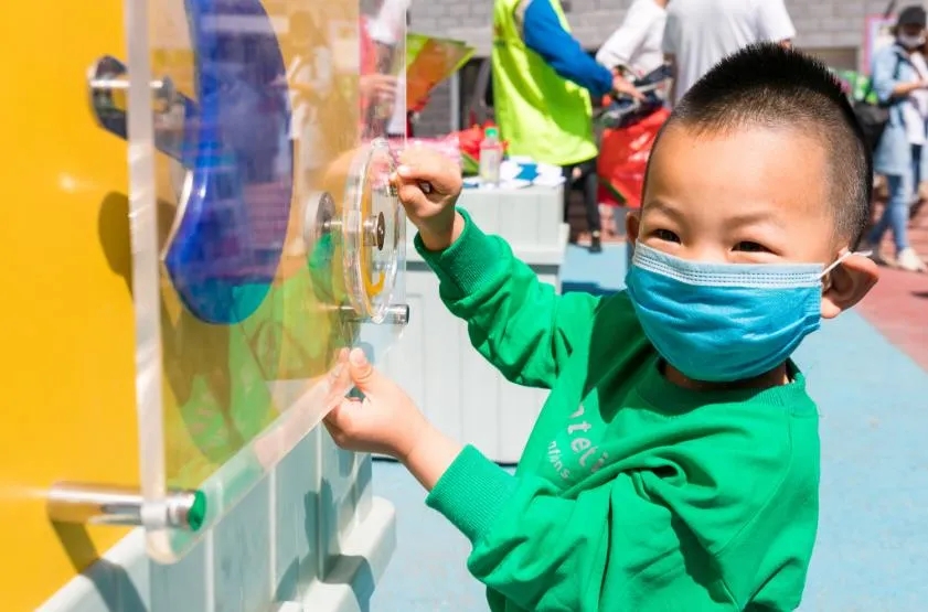 5月31日,呼和浩特市玉泉区清泉街社区的小朋友在体验科普装置。(摄影:丁根厚)