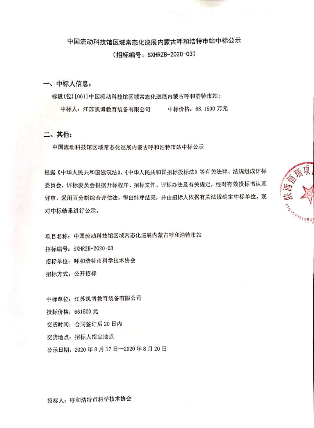 中国流动科技馆区域常态化巡展内蒙古呼和浩特市站中标公示