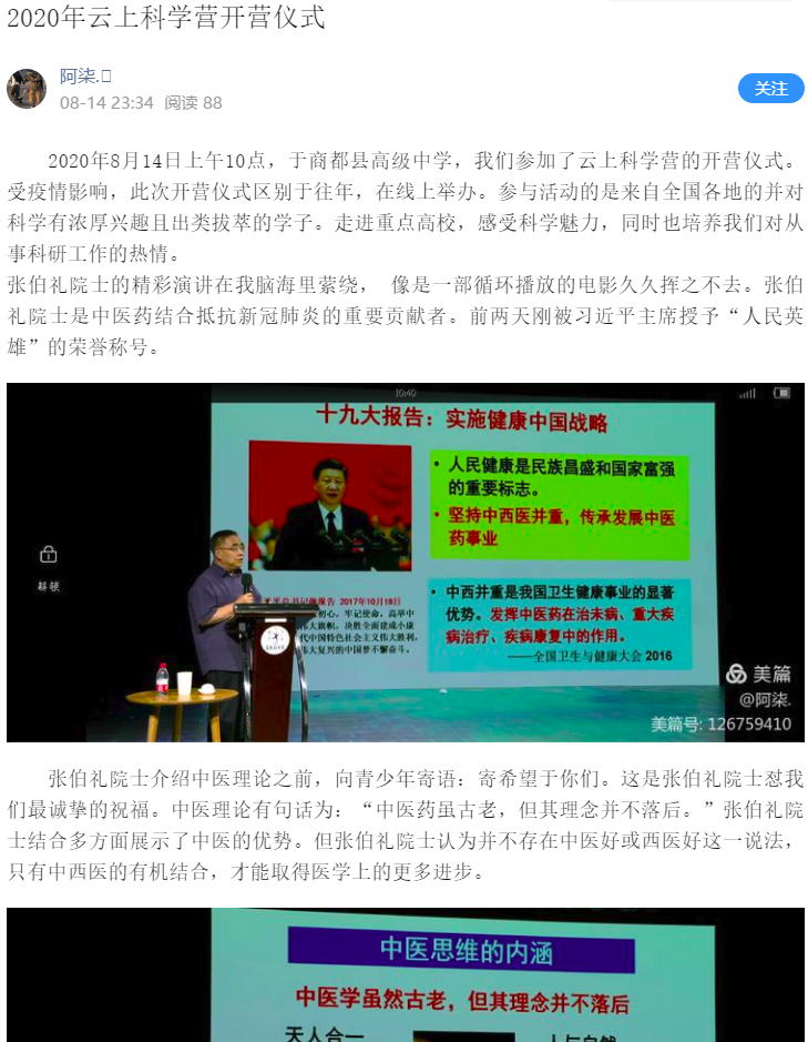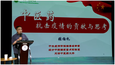 开营式上,荣获“人民英雄”国家荣誉称号的张伯礼院士亲临活动现场作开营第一课主题报告。张伯礼院士介绍了抗疫前线的一些情况,他说,“中医学虽然古老,但其理念并不落后”,抗击疫情的过程中,我国医护人员坚持中西医结合的理念,取得了明显的成效。他还详细介绍了部分患者突然转重、恢复期核酸复阳、核酸检测常阳等问题,总结了中医药在新冠肺炎临床疗效方面的特点和规律,介绍了中医药参与救治的情况,介绍了中医药参与救治的四个贡献,普及了应对新冠肺炎的居家防护的知识。
