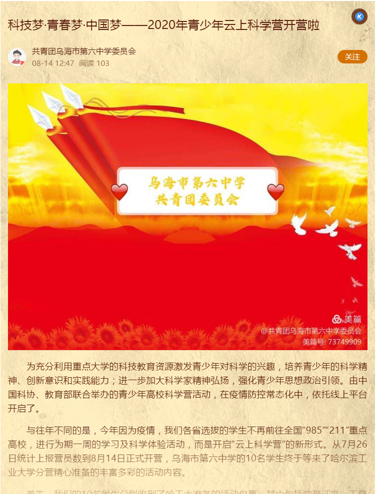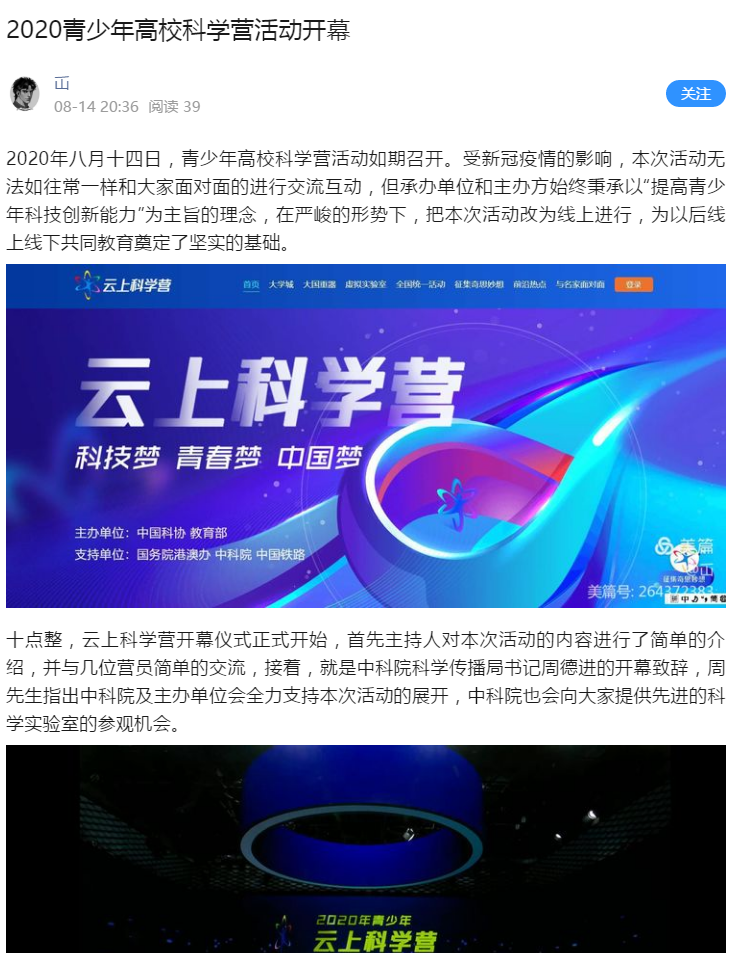 我区各地中学生广泛关注2020年青少年云上科学营开营仪式。小编搜到了好多所学校组织同学们线上参加开营仪式。