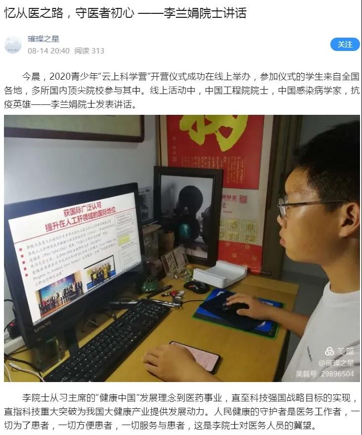 来自海峡两岸及港澳地区的1.3万名高中生和领队老师以及全国广大青少年齐聚网络终端,共同参加2020年青少年“云上科学营活动”开营仪式。开营式以直播的形式向全国公众和青少年开放。下面是我校部分同学参加仪式的照片。