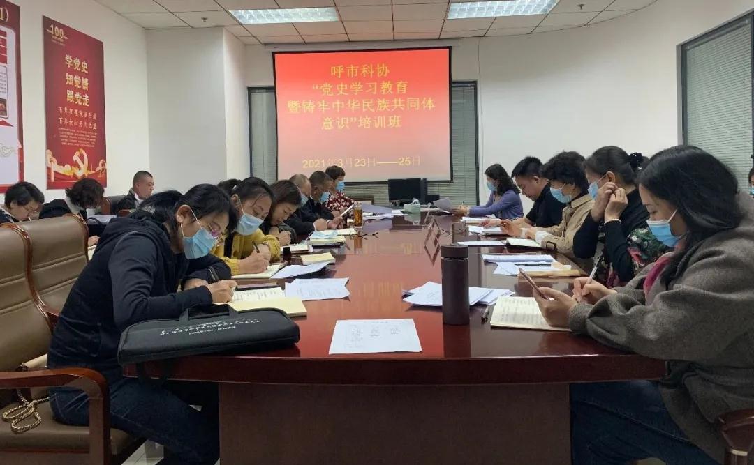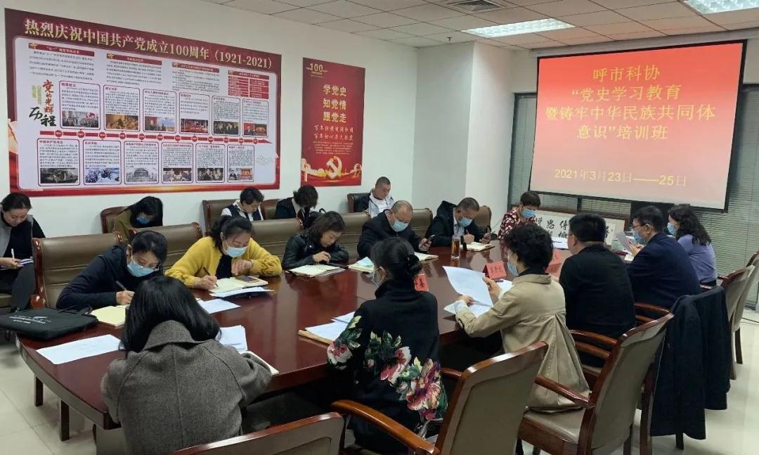 为持续深入开展好呼和浩特市科学技术协会党史学习教育工作,深入学习贯彻习近平总书记在党史学习教育动员大会上的重要讲话精神,深入学习贯彻习近平总书记在参加十三届全国人大四次会议内蒙古自治区代表团和青海省代表团审议以及政协十三届四次会议医药卫生界教育界委员联组会时的重要讲话精神,引导科协党员干部树立以人民为中心的发展思想,着力融入和服务新发展格局,铸牢中华民族共同体意识,巩固发展民族团结大局,切实把党的历史包括在内蒙古的历史学习好、总结好、传承好、发扬好,进一步加强科协组织和干部队伍建设,推动科协事业实现新的发展,3月23至3月25日,呼市科协举办了“党史学习教育暨铸牢中华民族共同体意识”集中学习培训,机关各部室及所属二级单位全体党员、干部职工参加了培训学习。