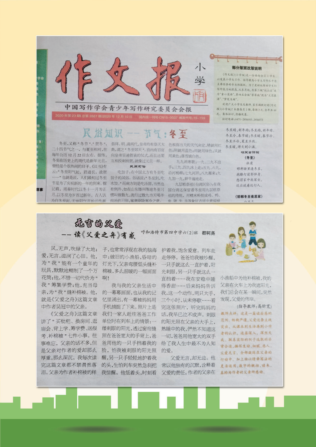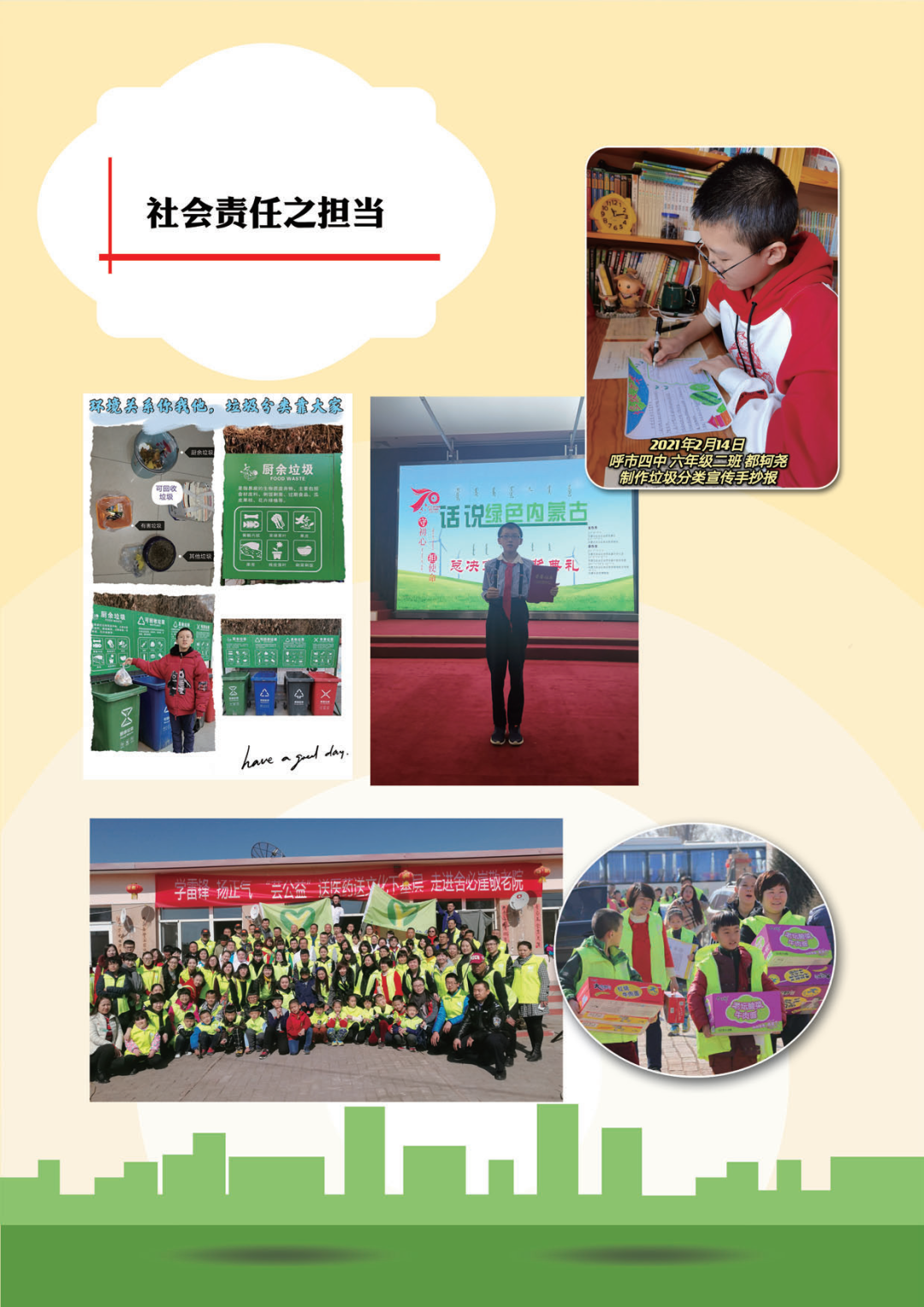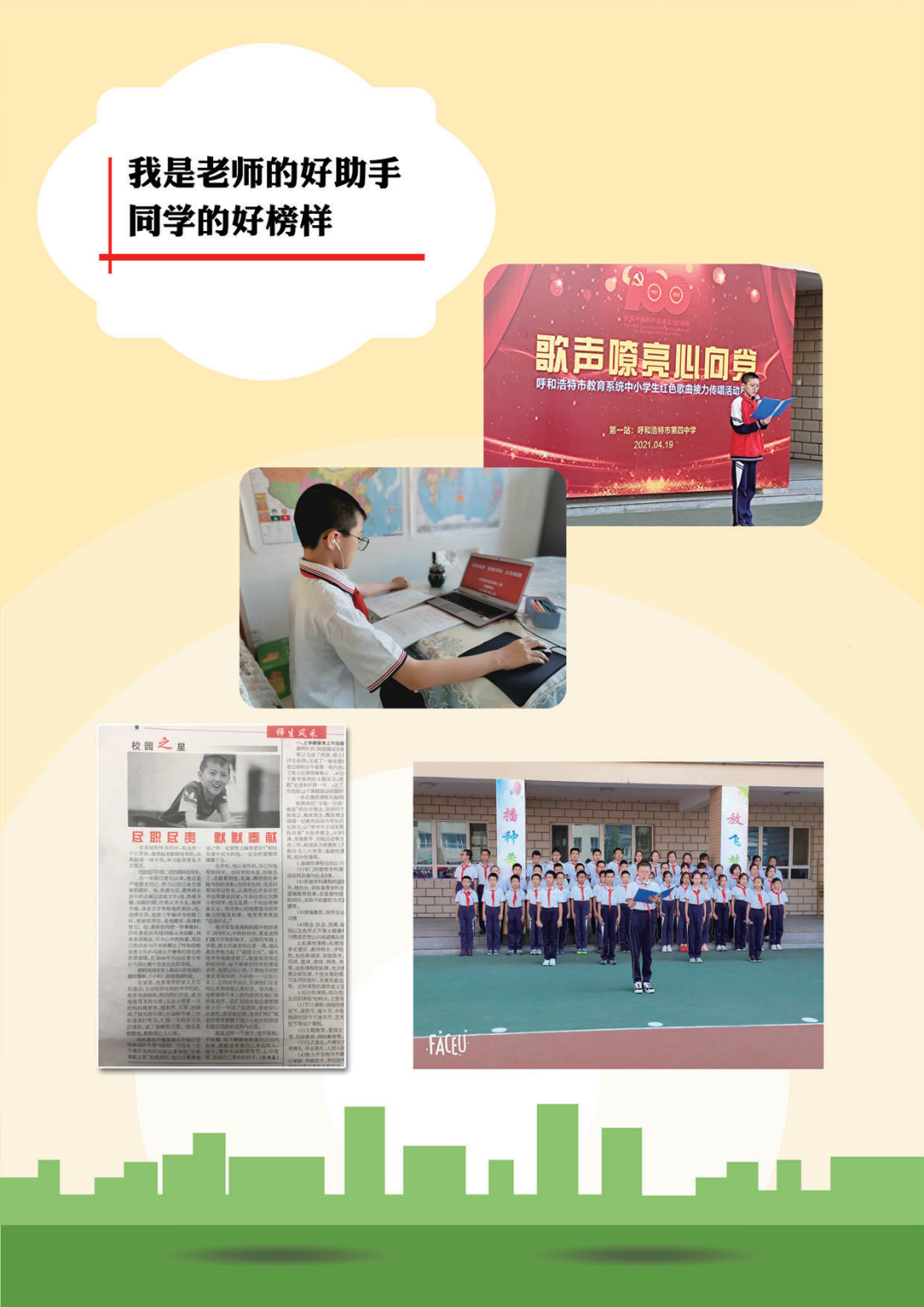 走进美丽的呼和浩特市第四中学六年级二班,你总能看到这样一个勤奋的身影,总能听到同学们对他发自内心的赞叹,这是一个心向阳光,尽职尽责的快乐男孩儿,他叫都轲尧。一位品学兼优,多才多艺,全面发展的好学生。 少年强则国强,少年智则国智。对于都轲尧同学而言,将来为中华民族伟大复兴奉献力量,是这位新时代少年的宏远目标。 他,热爱生活,喜欢将生活中的点滴记录成文字;他,热爱书籍,闲暇时间,经常以书为友,徜徉书海,体会文字带给他的美好;他,成绩优异,连续六年被评为校级三好,荣誉的背后,是他踏实、低调的努力。 从入学以来,都轲尧一直担任班长的职务,出于对班级的热爱和负责,他努力地配合班主任把班级工作做得有条不紊。他是老师们离不开的得力助手。疫情期间,他坚持每一天为同学们监测体温,为每一位同学的生命安全保驾护航;老师外出期间,他积极主动承担班会主持工作,帮助同学养成好习惯。他还是学校的大队委成员之一,校播音员,走廊文化讲解员,每周一次的校升旗仪式主持人,每月一次的大型校会主持人,校园的每一个角落总有他奔波忙碌的身影,可他乐此不疲。 都轲尧以身作则,尽己所能帮助同学。当同学的水壶、校服丢了,总能看到他,走廊、操场到处奔跑寻找的身影;当同学生病,他及时帮同学记作业,认真传达并亲自把书包帮着送回家;当面对学习有困难的同学时,他常常主动帮助,答疑解惑。马上要开运动会了,他每天下午组织同学们集体跳绳,烈日炎炎下,挥洒着他热情的汗水。阳光热心的他愿意为同学做力所能及的事。他常常笑笑说“这没什么。” 2020 年的春天,在与“新型冠状病毒”对战的时刻,不只有奋战在一线的“逆行英雄”,也有着克已向上,自立自强的莘莘学子,都轲尧便是其中一个,在这个漫长的寒假里,把灾难当教材,与祖国共成长。这就是一个十二岁孩子的家国情怀。身为中华小小少年,他用自己的实际行动,参与战“疫”,播撒阳光。他亲手制作手抄报科普宣传疫情,制作微视频为奋斗在一线的所有人员送上感恩与祝福。在疫情期间,他主动召开线上“追求卓越,勤奋求知”的主题班会,鼓励同学们时刻关注疫情,与祖国共渡难关。看到无数抗疫战士前赴后继,奔驰一线,他几度泪目,《逆向前行,最美背影》一文,他写得极为深情,获全国中小学生“万众一心,抗击疫情”专题征文一等奖。他以我手写我心,写出了一个小小少年的赤子中华情。