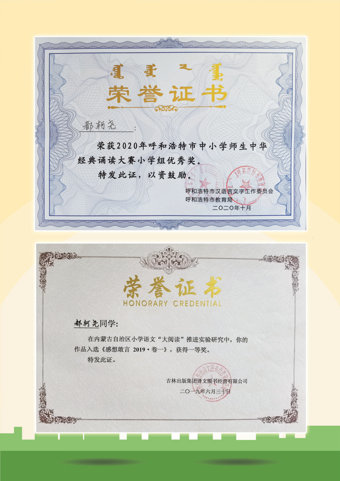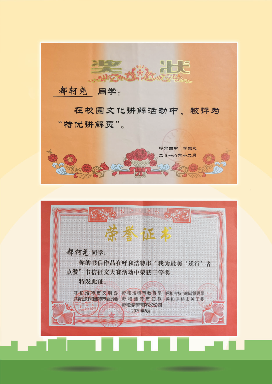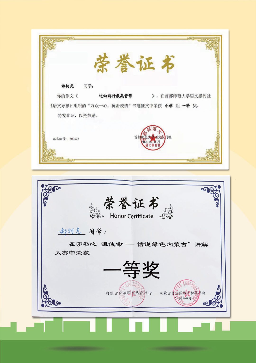 平时,都轲尧也会积极参与校内外的各项活动,历练本领,全面发展。祖国七十华诞,举国欢庆,他参加“守初心,担使命,话说绿色内蒙古”演讲大赛,取得了自治区一等奖的优异成绩。那一刻,人们记住了这个年仅十二岁的小小演讲家,他为自己的家乡代言,让所有人爱上了绿色发展中的内蒙古。为了追求梦想,他从市赛走到省赛,最终站到了全国青少年电子信息智能创新总决赛的赛场上,并取得了全国二等奖的优异成绩。