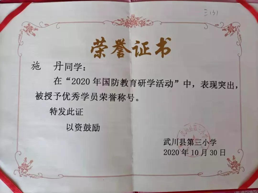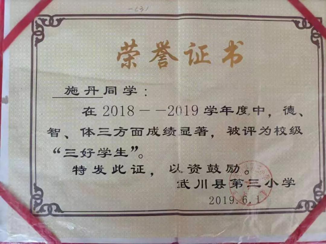 施丹同学在校表现一贯优良,学习认真,责任心强,先后获得优秀三好生、优秀少先队员等荣誉,是大家公认的好学生、好同学、好孩子。