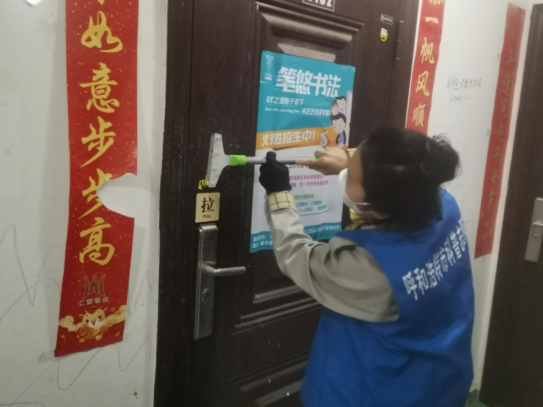 活动中,志愿者们积极发挥奉献精神,首先做好自身防护,紧接着开展热火朝天的工作,不怕脏、不怕累,拿着铲子、喷壶等工具,对单元楼、墙面、楼梯扶手上的小广告进行逐一清除,居民们看到后也深受感染,纷纷搭手帮忙,大家热情洋溢,干劲十足。