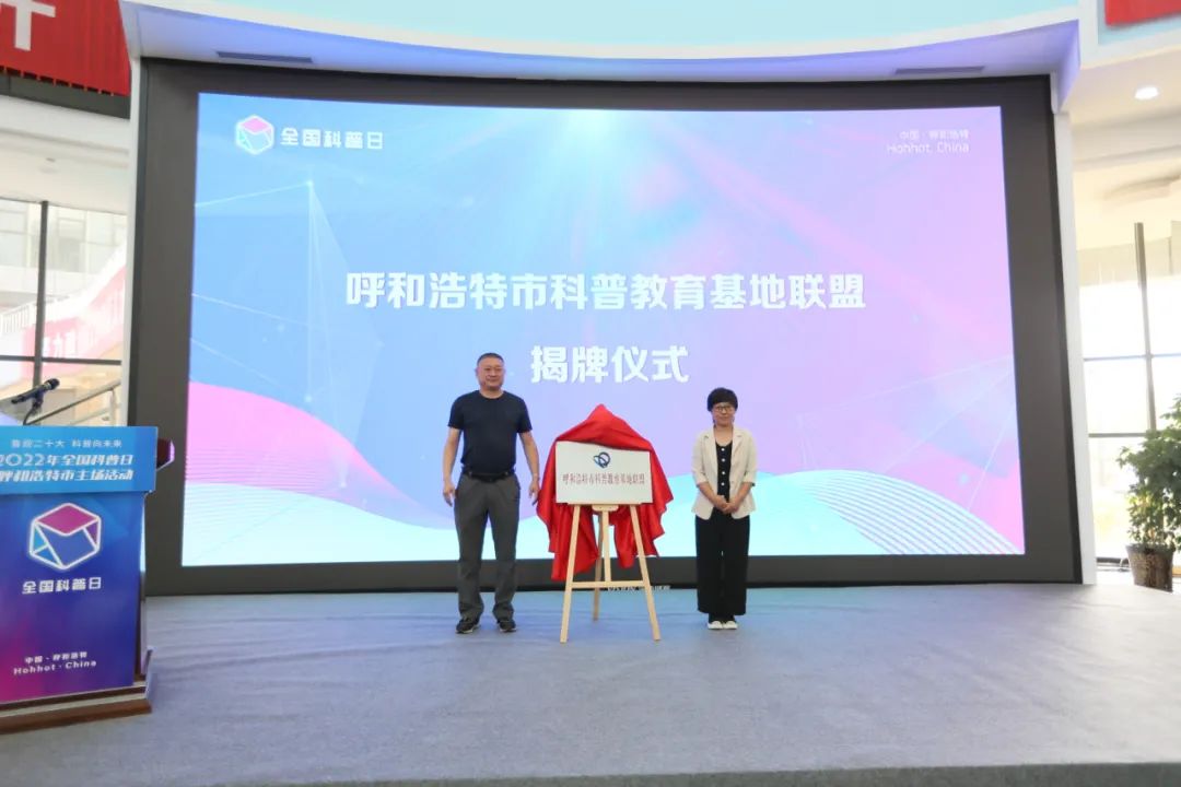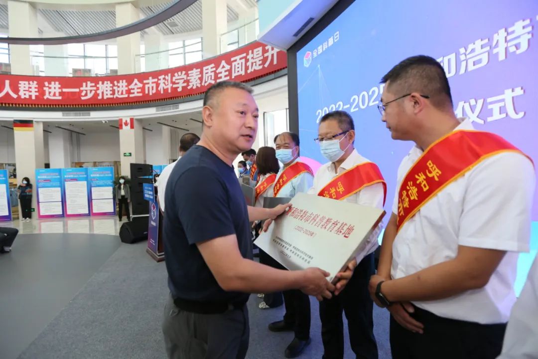 (市科协副主席何存,市委宣传部四级调研员向红,市科技局党组成员、副局长成博,市生态环境局副局长李永胜,市科协党组成员、科普部部长巴特尔为呼和浩特市科普教育基地代表授牌)