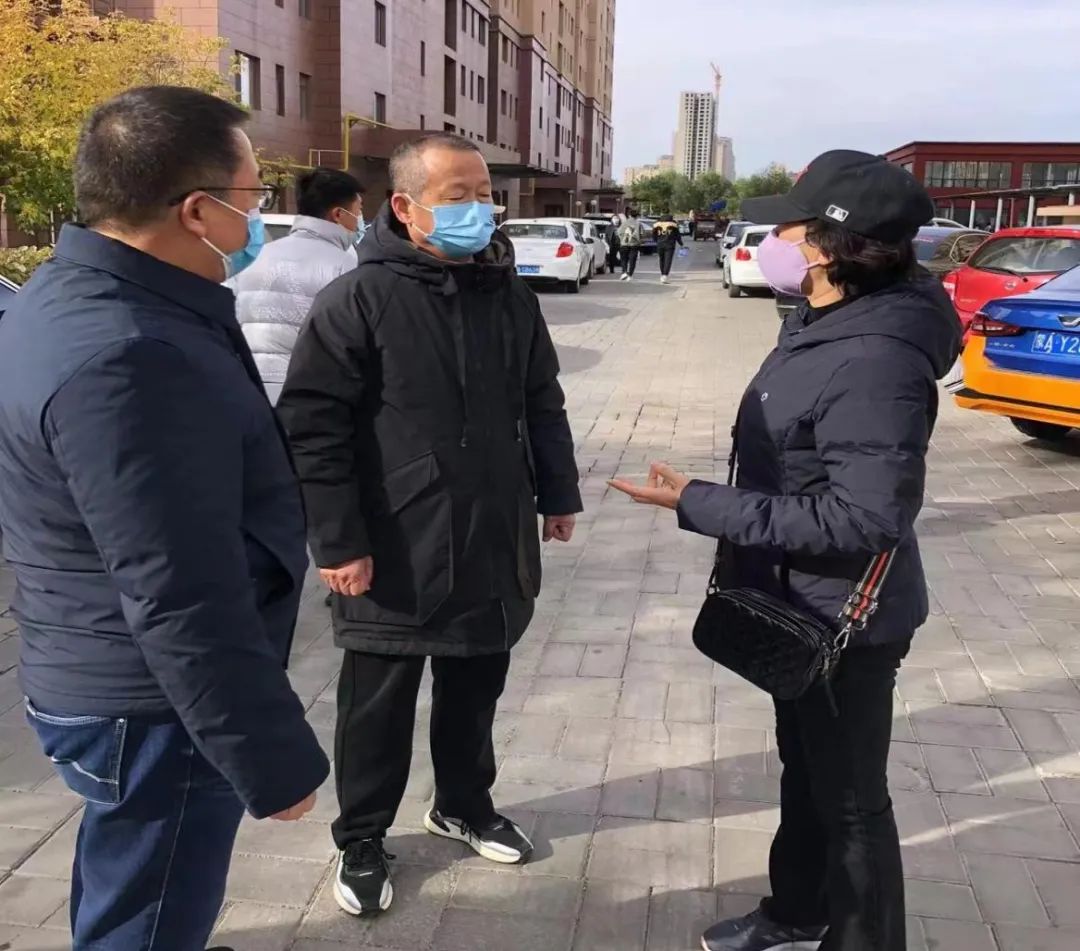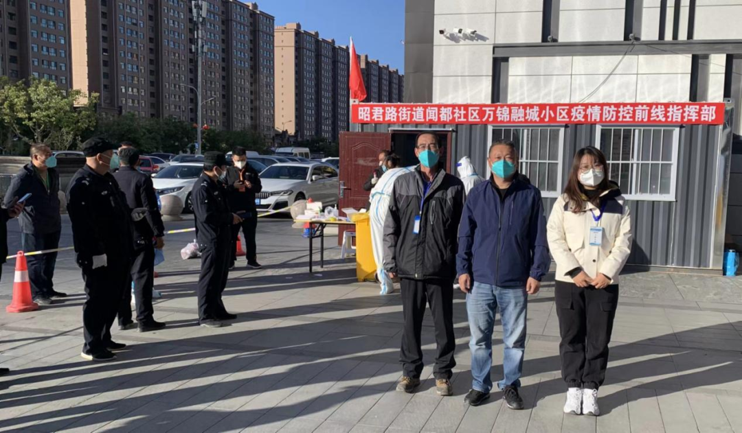 (呼市科协主席吴坪晏、机动员巴特尔、张慧峰与社区沟通疫情防控工作)