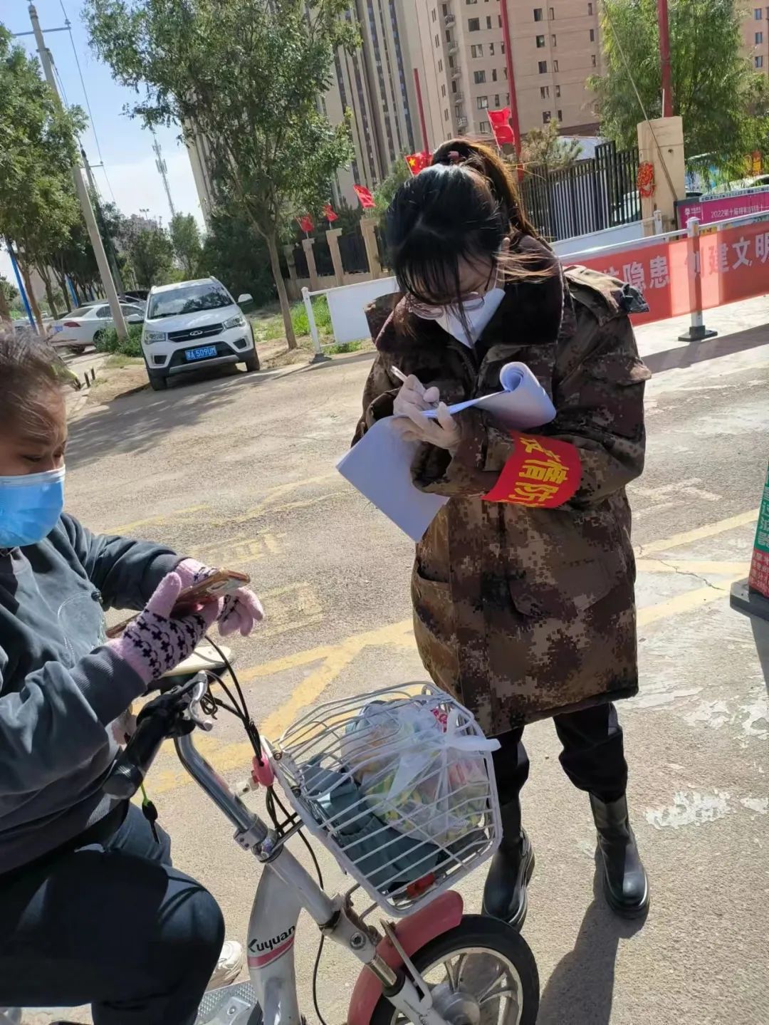 孙婷、特日格乐,分别是市科协办公室和科普部的工作人员。疫情爆发后,她们积极响应号召,争当疫情防控的志愿者。在包联社区进行疫情防控工作,她们认真检查每一辆车、每一个进入小区人员的行程码、健康码,测量体温,通过温馨提示来提醒进出人员佩戴口罩、保持距离,配合社区开展防控工作。