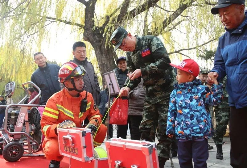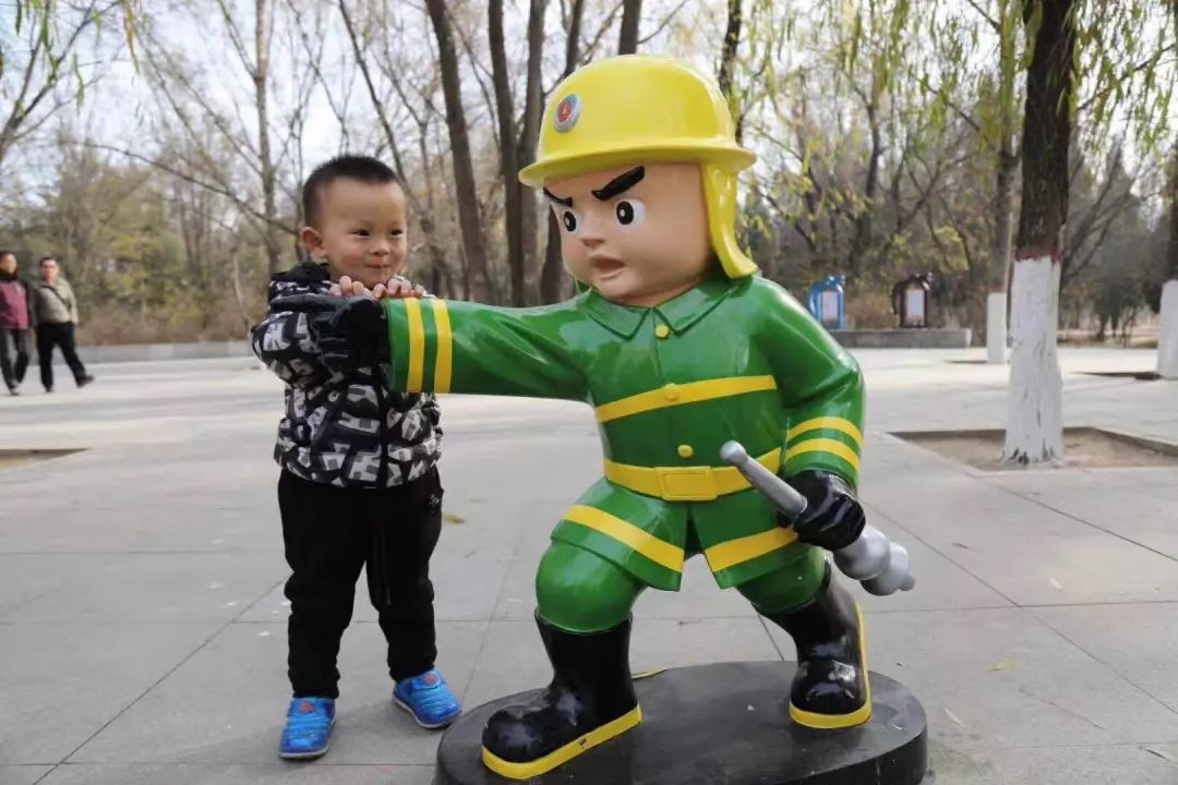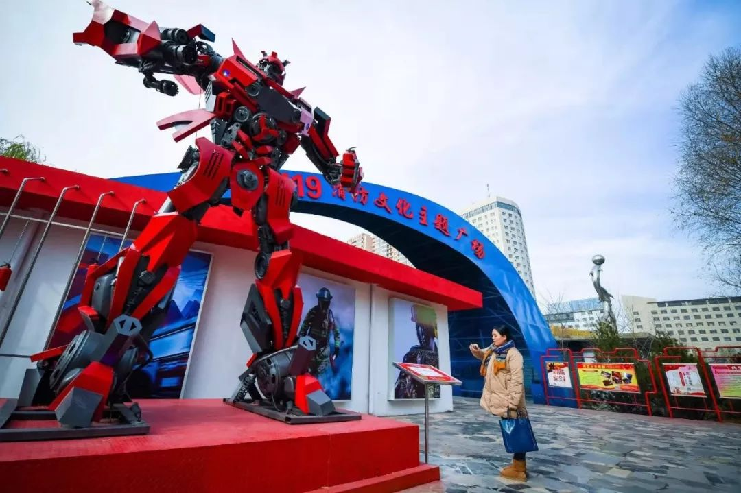 在青城公园北门进门处,放置了烈火金刚模型,巨大的变形金刚站在入口处既吸引孩子的眼球又能播放消防安全提示。以钢筋铁骨之势,担起消防工作的历史责任,传承消防文化的坚毅神。
