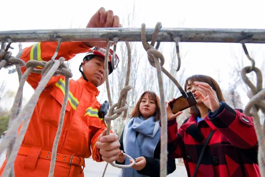 广场内还有一处专门的打绳结区域。对于消防官兵来说,打结绳是必备的技能之一,灵活运用绳结不仅能让消防员在火场中迅速解救被困人员,对消防员自身的安全也有很大帮助。