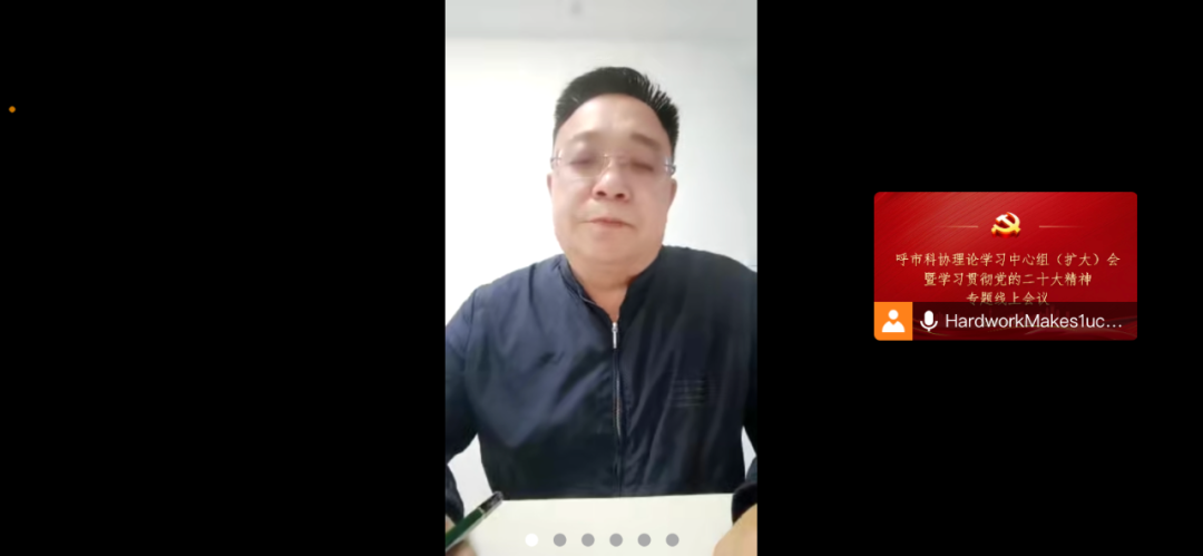 11月11日,呼和浩特市科学技术协会召开党组理论学习中心组(扩大)会议,专题学习贯彻党的二十大精神,传达学习了《中共中央关于认真学习宣传贯彻党的二十大精神的决定》、《习近平主持二十届中共中央政治局第一次集体学习并发表重要讲话》、《孙绍骋在通辽市宣讲党的二十大精神》等内容,并结合相关视频进行了深入学习贯彻。会议由市科协党组成员、秘书长巴特尔主持,党组书记李开元做总结讲话,各部室及二级单位全体人员参加会议。会议以视频形式召开。