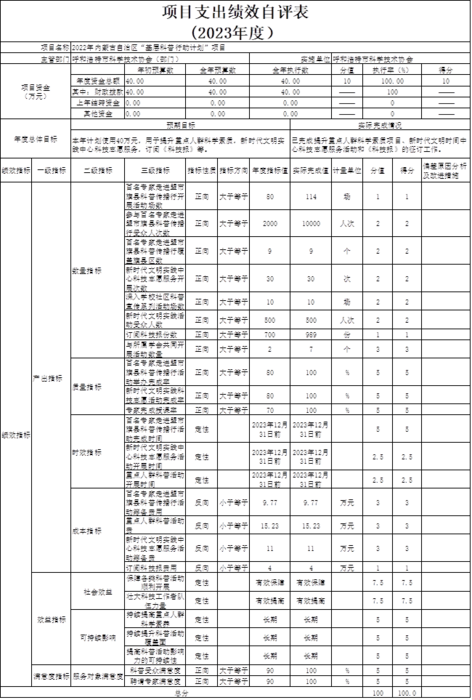 4.“2022年内蒙古自治区’基层科普行动计划’”项目自评综述:根据年初设定的绩效目标,项目自评得分100.00分。全年预算数为40.00万元,执行数为40.00万元,完成预算的100.00%。项目绩效目标完成情况:(1)百名专家走进盟市旗县科普传播行开展活动场数,目标值大于等于80场,实际完成114场。(2)参与百名专家走进盟市旗县科普传播行受众人次数,目标值大于等于2000人次,实际完成10000人次。(3)百名专家走进盟市旗县科普传播行覆盖旗县区数,目标值大于等于9个,实际完成9个。(4)新时代文明实践中心科技志愿服务开展次数,目标值大于等于30次,实际完成30次。(5)深入学校社区科普宣传系列活动场数,目标值大于等于10场,实际完成10场。(6)新时代文明实践活动受众人数,目标值大于等于500人次,实际完成500人次。(7)订阅科技报份数,目标值大于等于700份,实际完成989份。(8)与所属学会共同开展活动数量 ,目标值大于等于2个,实际完成7个。(9)百名专家走进盟市旗县科普传播行活动举办完成率,目标值大于等于80%,实际完成100%。(10)新时代文明实践科技志愿活动完成率,目标值大于等于80%,实际完成100%。(11)专家完成授课率,目标值大于等于70%,实际完成100%。(12)百名专家走进盟市旗县科普传播行活动完成时间,目标值2023年12月31日前,实际完成2023年12月31日前。(13)新时代文明实践中心科技志愿服务活动开展时间,目标值2023年12月31日前,实际完成2023年12月31日前。(14)重点人群科普活动开展时间,目标值2023年12月31日前,实际完成2023年12月31日前。(15)百名专家走进盟市旗县科普传播行活动筹备费用,目标值小于等于9.77万元,实际完成9.77万元。(16)重点人群科普活动费,目标值小于等于15.23万元,实际完成15.23万元。(17)新时代文明实践中心科技志愿服务活动筹备费,目标值小于等于11万元,实际完成11万元。(18)订阅科技报费用,目标值小于等于4万元,实际完成4万元。(19)保障各类科普活动顺利开展,目标值有效保障,实际完成有效保障。(20)壮大科技工作者队伍力量,目标值有效提高,实际完成有效提高。(21)持续提高重点人群科学素养,目标值长期,实际完成长期。(22)持续提升科普活动覆盖面,目标值长期,实际完成长期。(23)提高科普活动影响力的可持续性,目标值长期,实际完成长期。(24)科普受众满意度,目标值大于等于90%,实际完成100%。(25)聘请专家满意度,目标值大于等于90%,实际完成100%。本项目设置合理,无主要问题。下一步改进措施:(1)本项目为自治区科学技术协会向本地区转移支付的专项资金,后续加强预算管理,继续做好转移支付预算的绩效目标申报、监控及评价工作;(2)进一步规范预算执行管理,厉行节约,提高资金使用效益;(3)将继续按照上级要求做好基层科普行动计划工作,持续强化科普阵地,积极开展科普活动,进一步提升本地区全民科学素质。
