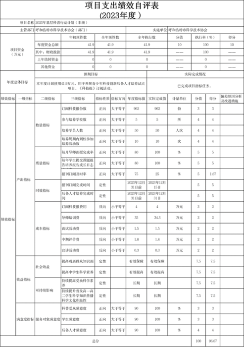 5.“2023年基层科普行动计划(本级)”项目自评综述:根据年初设定的绩效目标,项目自评得分96.67分。全年预算数为41.90万元,执行数为41.90万元,完成预算的100.00%。项目绩效目标完成情况:(1)订阅科技报份数,目标值大于等于962份,实际完成962份。(2)参与培养学校数,目标值大于等于5所,实际完成5所。(3)培养学员人数,目标值大于等于50人次,实际完成50人次。(4)培养周期内到校参加培养活动数,目标值大于等于10次,实际完成10次。(5)每月导师面授完成率,目标值大于等于80%,实际完成100%。(6)每年学生提交课题报告培养报告成长日志完成率,目标值大于等于80%,实际完成100%。(7)报刊订阅及时率,目标值大于等于75%,实际完成25%。(8)报刊订阅完成时间,目标值2023年12月31日前,实际完成2023年12月15日。(9)后备人才培养完成时间,目标值2023年12月31日前,实际完成2023年12月31日。(10)订阅科技报费用,目标值小于等于4万元,实际完成4万元。(11)导师培训费,目标值小于等于35万元,实际完成34.3万元。(12)面试活动费,目标值小于等于1.5万元,实际完成1.5万元。(13)中期评价费,目标值小于等于1.8万元,实际完成1.8万元。(14)宣讲活动费,目标值小于等于0.3万元,实际完成0.3万元。(15)提高观展群众知识面,目标值有效保障,实际完成有效保障。(16)提高中学生科学素养,目标值有效提高,实际完成有效提高。(17)持续提高受众科学素养,目标值长期,实际完成长期。(18)持续提升普及高一高二学生科学知识传播科学文化积极性,目标值长期,实际完成长期。(19)科普受众满意度,目标值大于等于90%,实际完成100%。(20)学生满意度,目标值大于等于90%,实际完成100%。(21)后备人才满意度,目标值大于等于90%,实际完成100%。主要问题及原因:未完成及时订阅报刊的指标。下一步改进措施:(1)调整报刊订阅时间为年底订阅下一年报刊,保证下一年全年的报刊能及时、完整订阅;(2)继续按照上级要求做好基层科普行动计划工作,持续强化科普阵地及科普活动和科普队伍建设,进一步提升本地区全民科学素质。