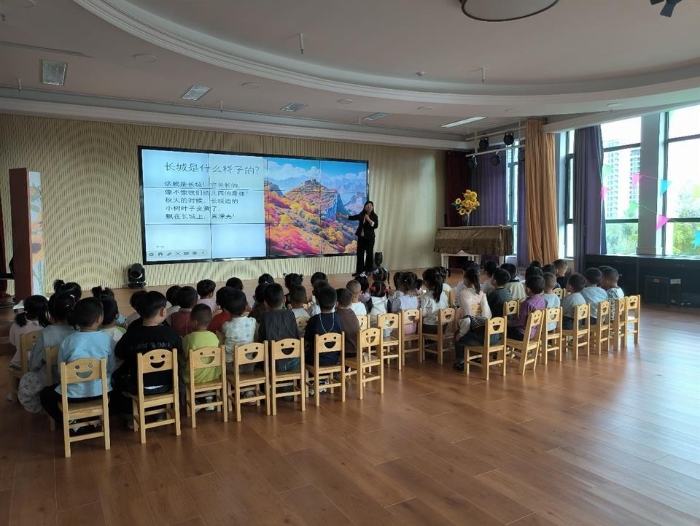“小朋友们看!今天我们要去一个地方 —— 长城,而且现在是秋天,长城边的树叶都穿上黄衣服啦,想不想一起去看看?” 讲座一开场,高晓梅就用亲切的话语和生动的卡通画面,勾起了孩子们的兴趣。大屏幕上,夏天的绿色银杏叶、枫叶满是生机,配着“树叶穿绿 T 恤”的可爱文字,与秋天的银杏染金、枫叶泛红,标注“换黄外套”形成鲜明对比,“夏天树叶穿什么颜色衣服呀?”“绿色!”孩子们纷纷举起小手,响亮的回答让现场热闹起来。