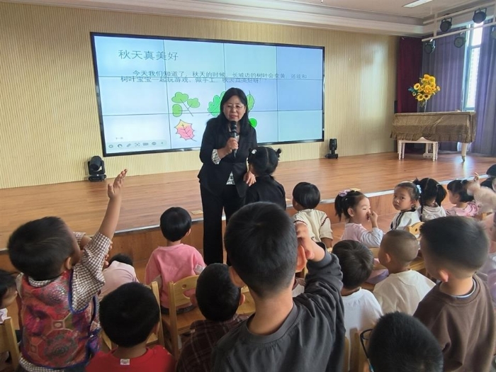 讲座最后,大屏幕上出现了一幅卡通大合照:长城、黄树叶、笑着的小朋友、带笑脸的太阳,周围飘着“秋天快乐” 的小气泡,配着“长城 + 黄树叶 = 秋天的小美好” 的文字。“今天我们知道了,秋天长城边的树叶会变黄,还能和树叶宝宝玩游戏、做手工,秋天真美好呀!”高晓梅的总结温柔又有力,孩子们跟着念出“秋天快乐”,脸上满是满足。